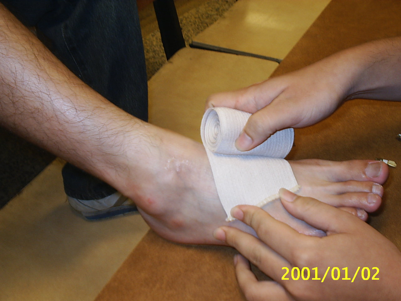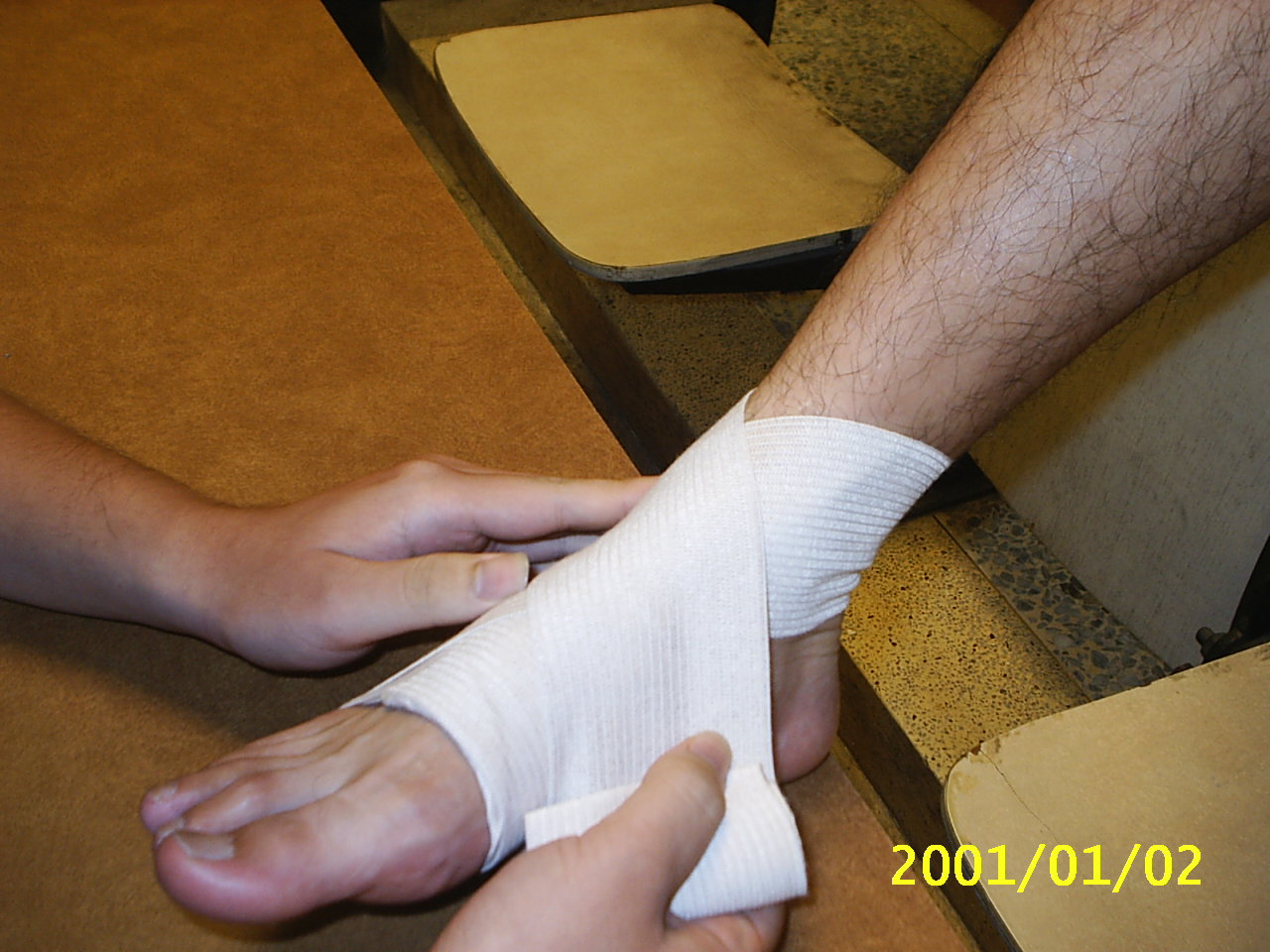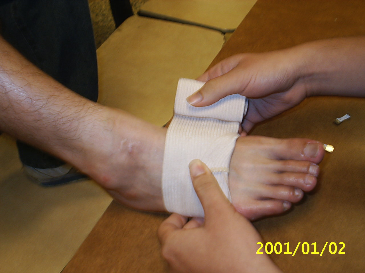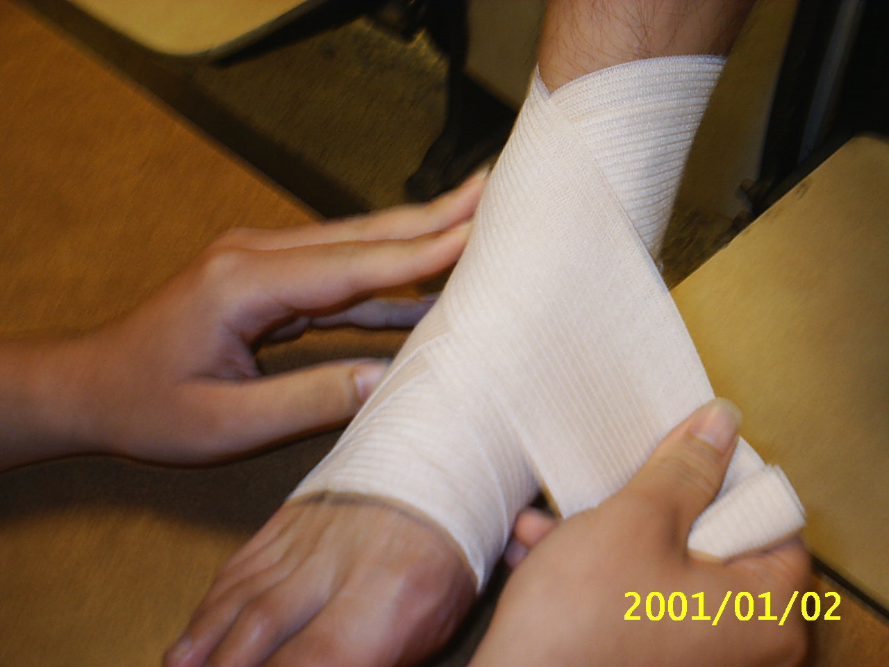 彈繃包紮的好處在於其彈性佳,延展性好,對於傷處較為服貼,且較三角巾方便使用.在這裡我們示範常用螺旋包紮法及扭傷踝部時的八字型包紮法. 示範者:陳嘉夆 模特兒:吳宗勳 |