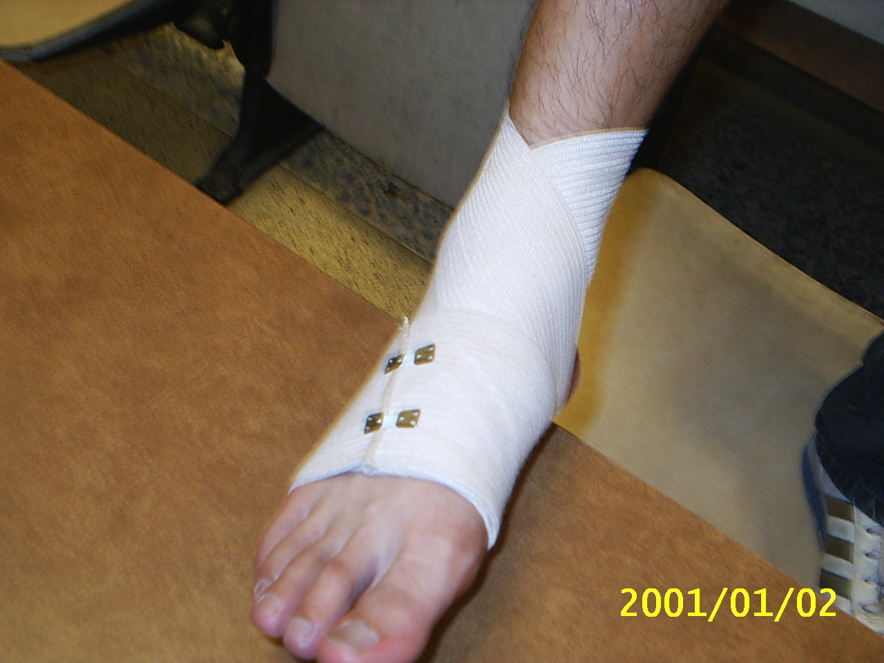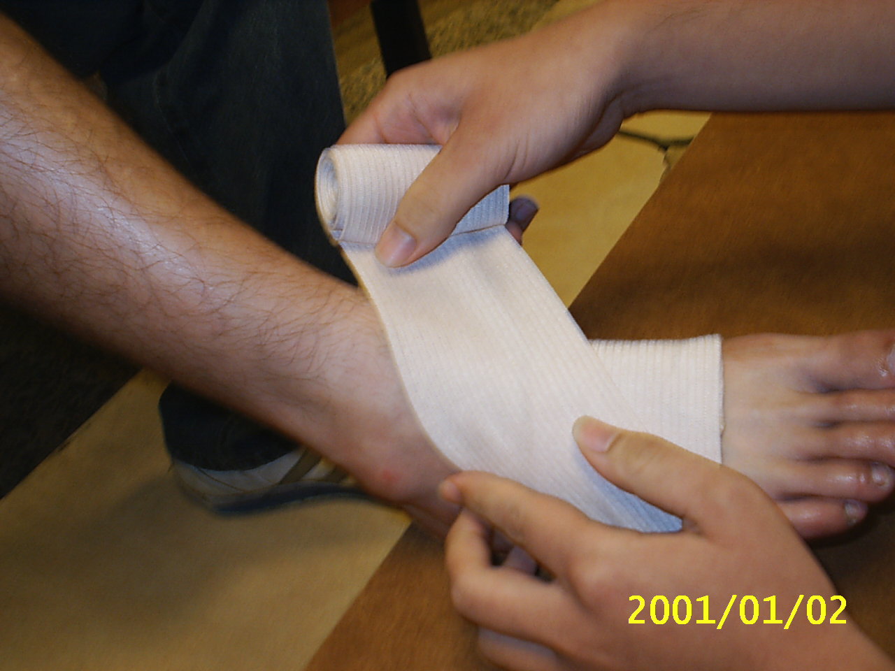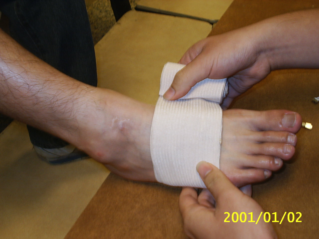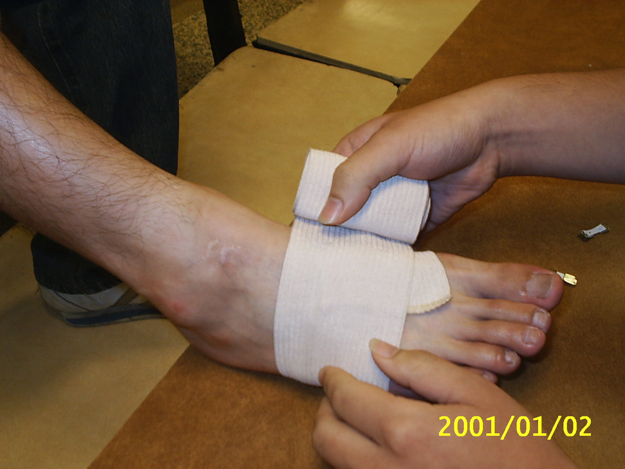 彈繃包紮的好處在於其彈性佳,延展性好,對於傷處較為服貼,且較三角巾方便使用.在這裡我們示範常用螺旋包紮法及扭傷踝部時的八字型包紮法. 示範者:陳嘉夆 模特兒:吳宗勳 |